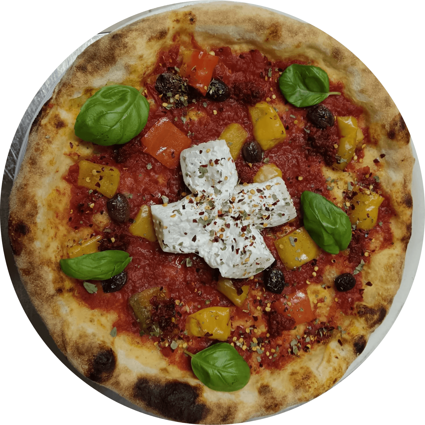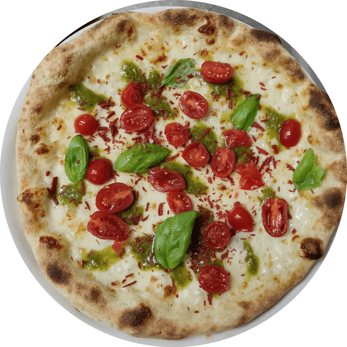 Pom, nduja Calabrese, peperoni, basilico, olive taggiasche, burrata affumicata, peperoncino